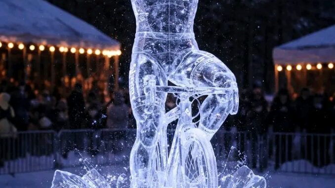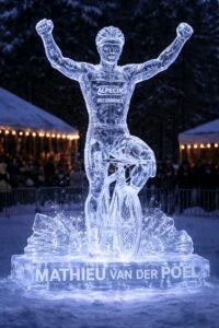 Onder de zachte gloed van de avondverlichting heeft een adembenemend ijsbeeld de essentie van wielerwonder Mathieu van der Poel vastgelegd. Triomfantelijk staand met opgeheven armen, weerspiegelt de bevroren figuur een van zijn vele onvergetelijke overwinningen, waarbij elk detail minutieus is uitgehouwen – van de plooien van zijn iconische “ALPECIN-DECEUNINCK”-shirt tot de strakke lijnen van zijn helm en zonnebril. Het kristalheldere ijs glinstert, reflecteert het omringende licht en werpt een bijna magische aura op, waardoor het lijkt alsof de kampioen zelf in de tijd is bevroren.